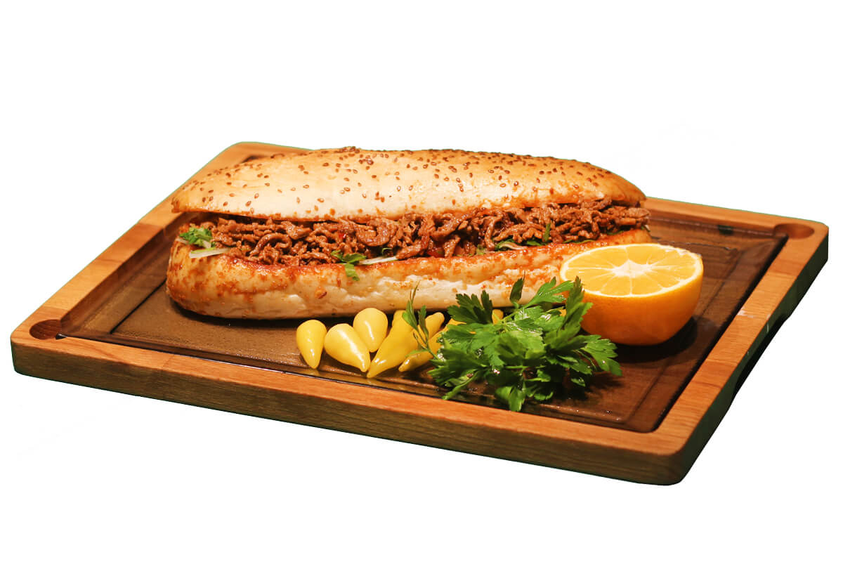 Yağsız biftek et tantuni, sumaklı soğan, domates, maydanoz ile 3 çeyrek somun ekmeğe hazırlanır.